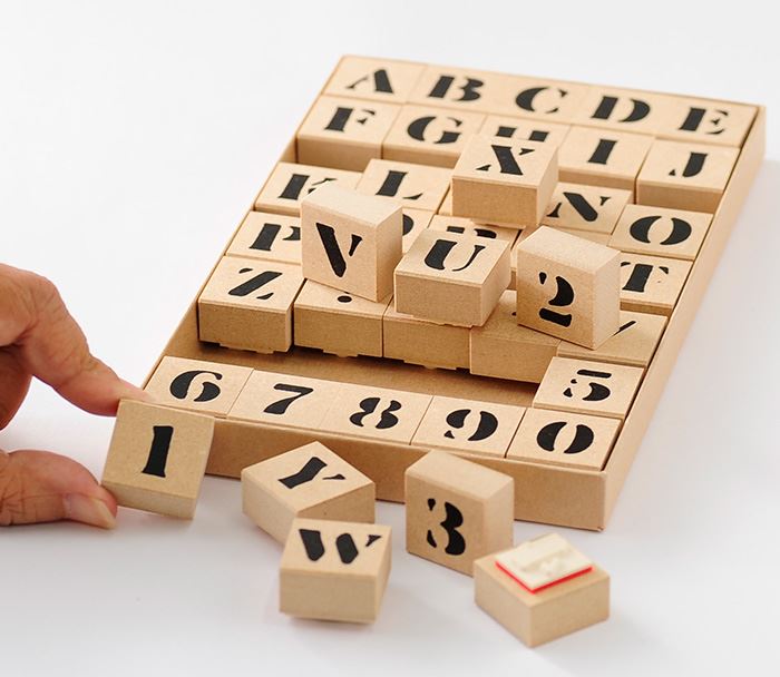 クラフトBOXに入ったステンシルアルファベットスタンプセットです。