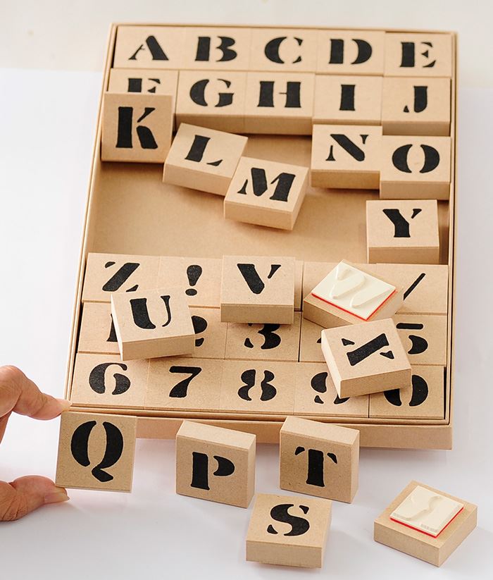 クラフトBOXに入ったステンシルアルファベットスタンプセットです。