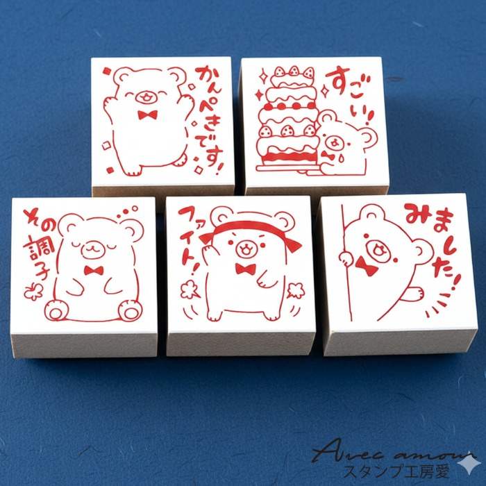 『みました かんぺきです すごい その調子 ファイト』の文字が5個セットになりました。くまさんがかわいく応援しています。